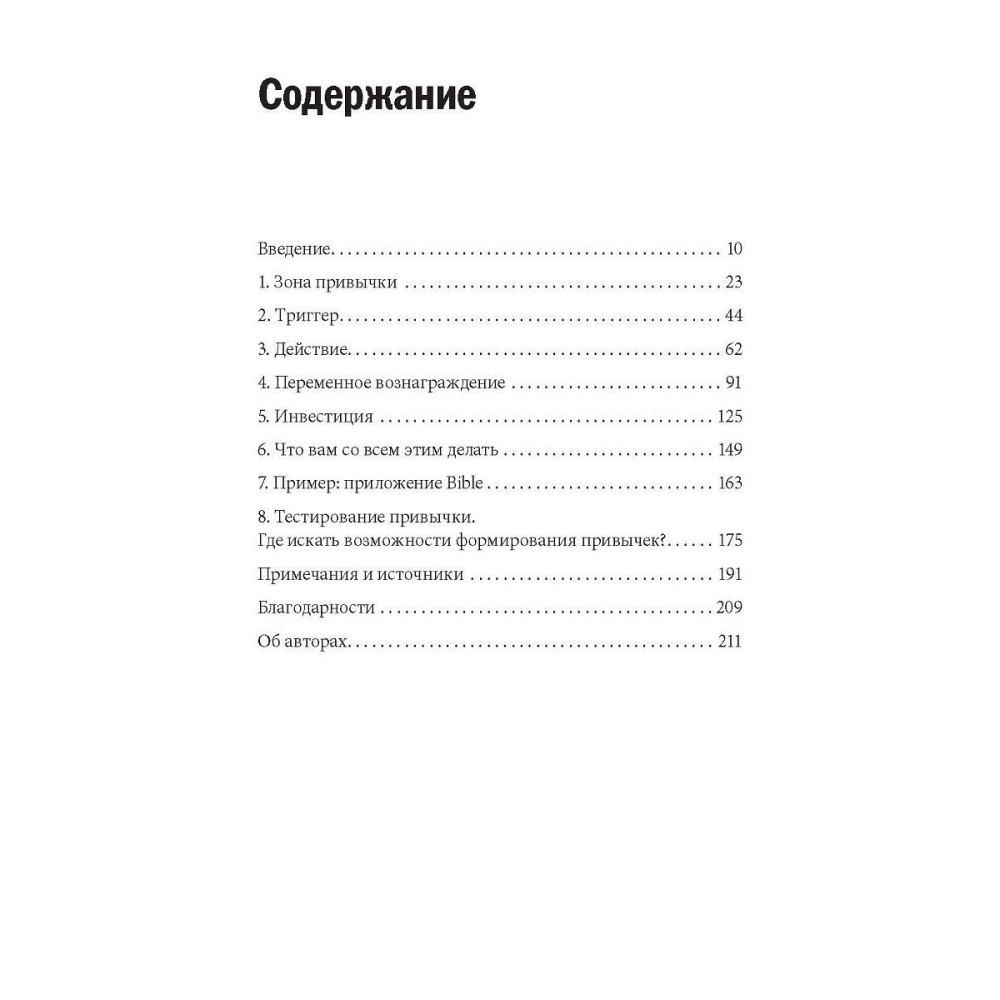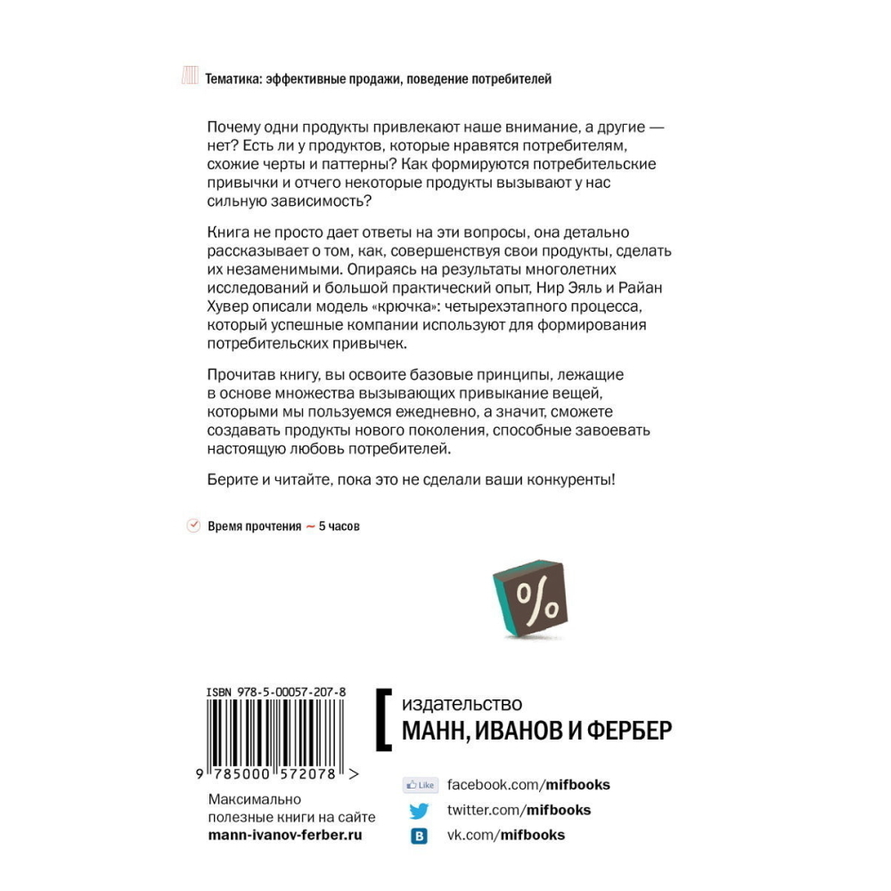 Эта книга полезна для маркетологов, дизайнеров, предпринимателей и всех интересующихся поведением потребителей. Она предлагает читателям: рекомендации по формированию устойчивых привычек; практические шаги для создания продуктов, которые будут нравиться потребителям; обзор инструментов, которые используют в Pinterest, Twitter, Instagram и других продуктах, вовлекающих потребителя и способствующих формированию привычек. Книга раскрывает сразу несколько тем: бизнес, психологию, убеждение и дизайн продуктов.